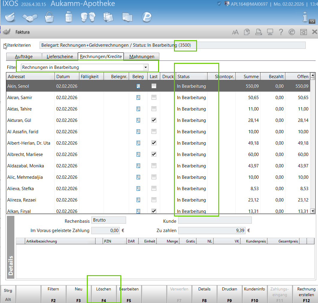 Alle Rechnungen "in Bearbeitung" müssen über löschen verworfen werden. (Natürlich nur die die "in Bearbeitung" sind....